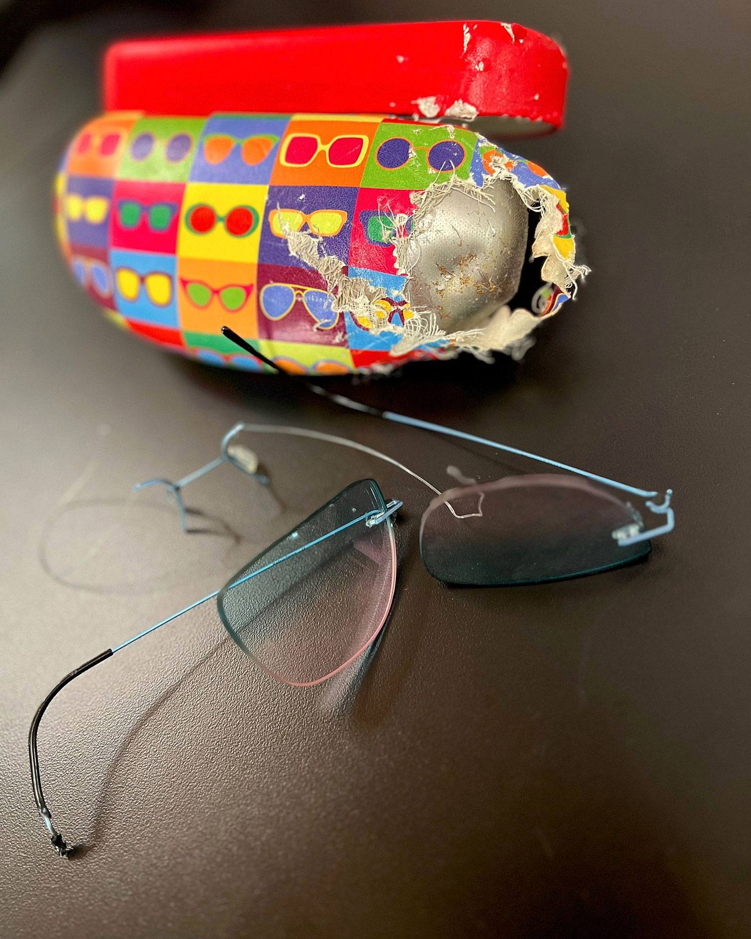 Good news: InSight Eyewear repairs glasses frames! The frames pictured survived with just a few scratches and a new string. The next time you have an eyeglasses emergency, stop by the shop at 490 Lighthouse Avenue in Monterey and we'll try to help you.