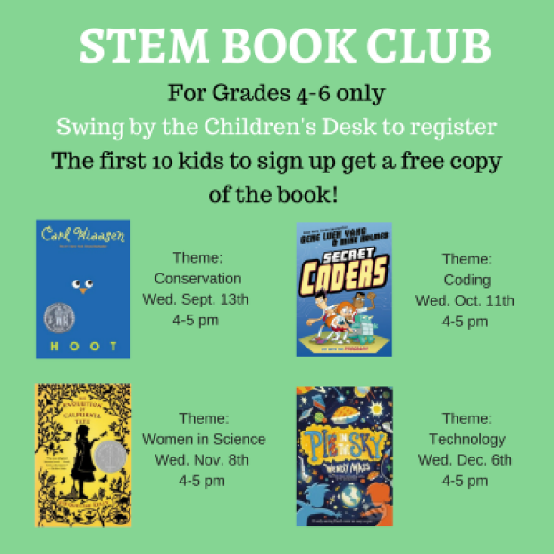 The STEM Book Club meets monthly on the second Wednesday of each month at the Campbell Library from 4 to 5pm. This month's title: The Evolution of Calpurnia Tate (Topic: Women in Science)