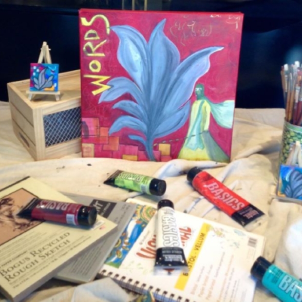 "Words Matter" - 16"x16" - multi-media painting by local artiste, Amy Steinberg. Find it among more of Amy's equally wonderful artwork in our front window.