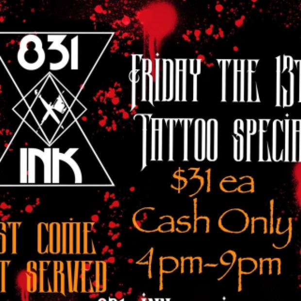 831 INK is offering a Friday the 13th Tattoo Special on May 13, 4pm-9pm. Featuring 831 INK designs in two colors for $31 each (cash only). First come, first served. Two tattoos max per person. No adjustments to size and no rainchecks.