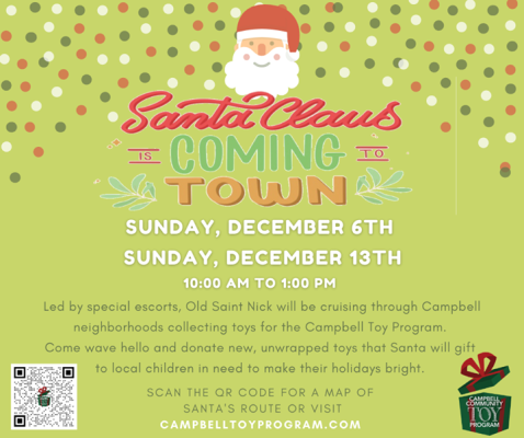 We have it on good authority that Santa Claus himself will be in Campbell this Sunday, December 6th and next Sunday, the 13th from 10am to 1pm. He'll be led by some very special escorts while he cruises through Campbell neighborhoods, spreading holiday spirit and collecting toys.