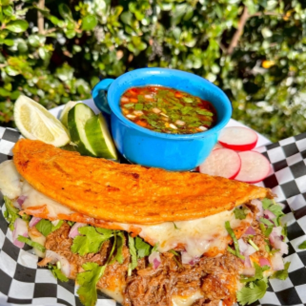 Our beef quesabirria is served Tijuana-style with melted cheese, onions, and cilantro in a freshly-made corn or flour tortilla with a side of consome (broth) for dipping. Visit us at 598 Lighthouse Avenue and try it.