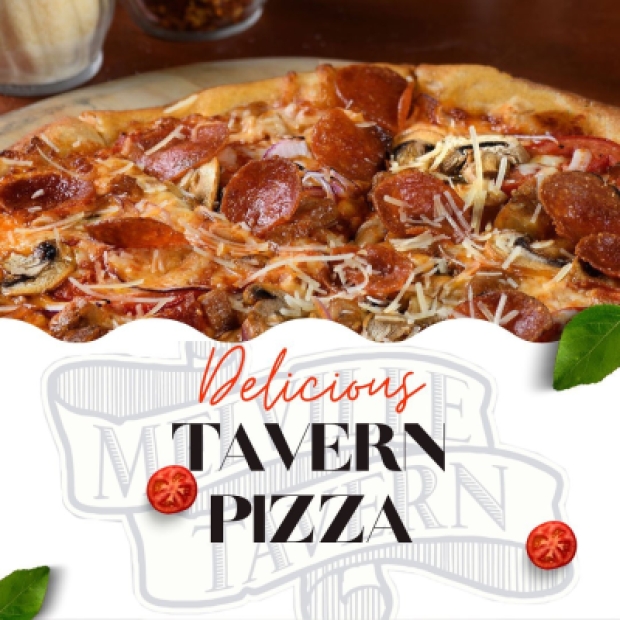 Did you know that Melville Tavern offers wood-fired pizza? Try the Tavern Pizza (pictured here) which includes housemade sausage, pepperoni, cremini mushrooms, mozzarella, red onions, and tomato. We have many pizza options in addition to all the great entrees, sandwiches, burgers, and salads on our menu. Visit us at 484 Washington Street.