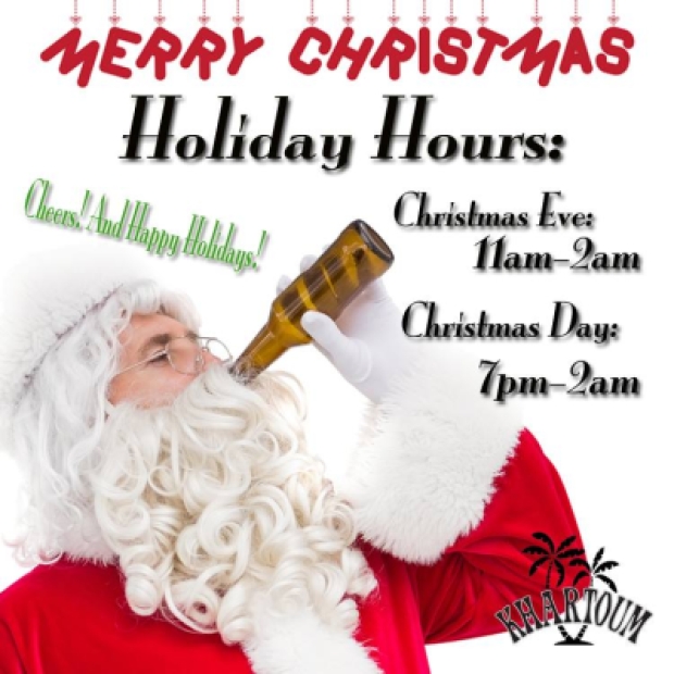 Khartoum will be Open for Christmas Campbell, CA Khartoum has special holiday hours for Christmas! We'll be open: Christmas Eve: 11am - 2am Christmas Day: 7pm - 2am Ho! Ho! Ho!