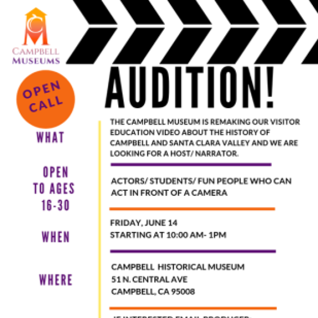 The Campbell Museum is remaking our visitor video about the history of Campbell and Santa Clara Valley. We are looking for a host/ narrator. We are holding auditions on June 14 at the Campbell Historical Museum.
