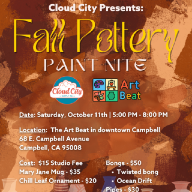 Unleash your inner artist and dive into a world of creativity at Cloud City's cannabis themed Fall Pottery Paint Nite with The Art Beat in downtown Campbell.